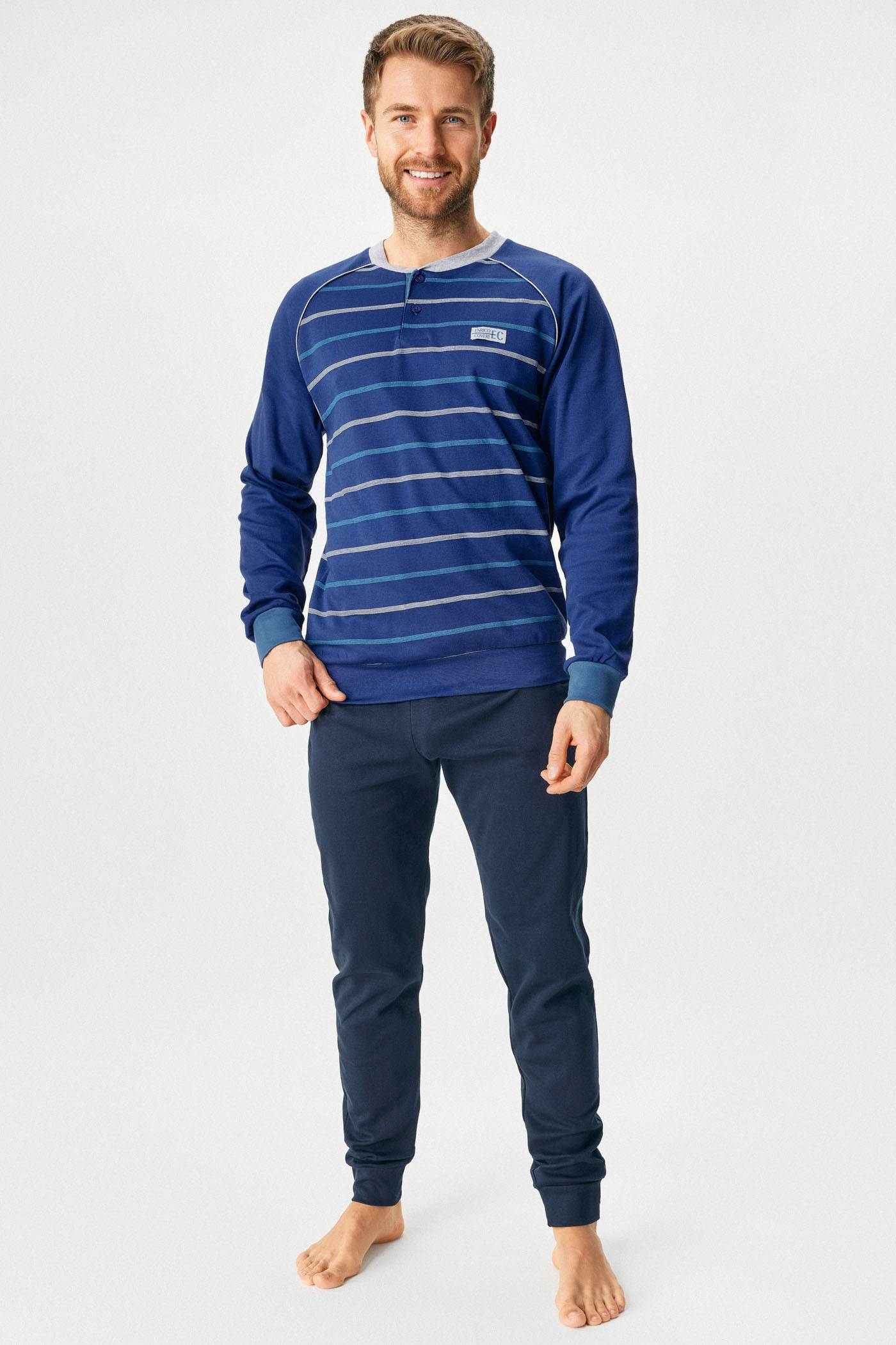 Bavlněné pyžamo Dean z měkkého úpletu pro vaše klidné spaní. Triko s dlouhým rukávam je potištěno decentním proužkem, dlouhé kalhoty jsou jednobarevné. Okraje zakončují manžety.
