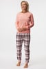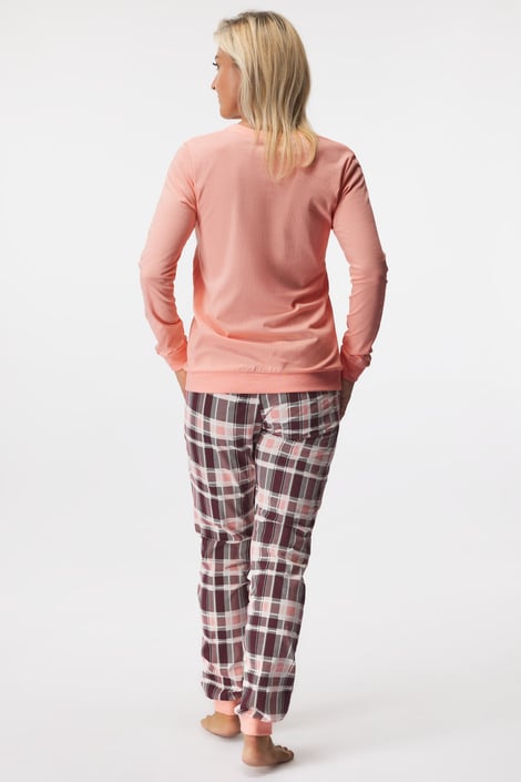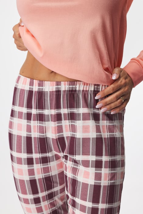 Dámské bavlněné pyžamo Folia pro vaše noční pohodlí. Tričko s dlouhými rukávy vyniká jemným růžovým odstínem, se kterým ladí kostkované kalhoty.