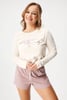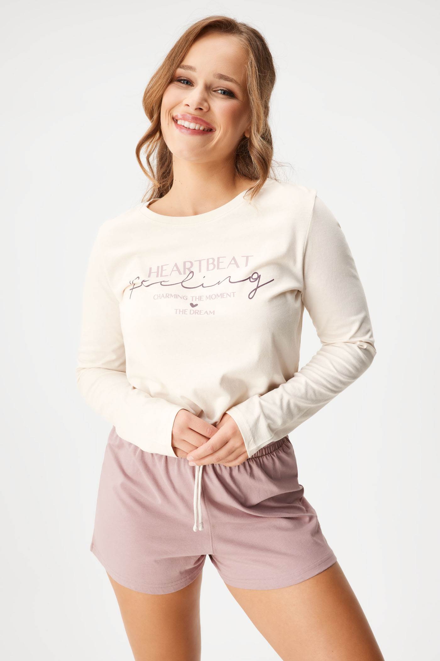 Dámské pyžamo Freya II ze 100% bavlny pro váš nerušený spánek. Horní díl s dlouhým rukávem a decentním nápisem je doplněn šortkami na gumu a navíc praktickým stahováním na šňůrku.