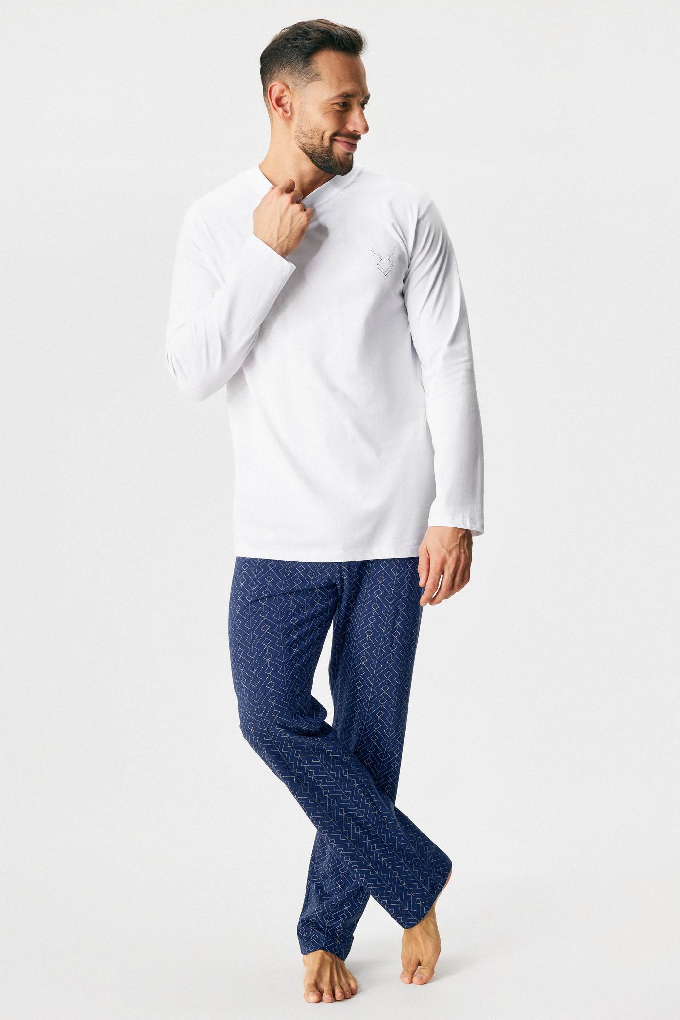 Dlouhé bavlněné pyžamo Leon z komfortního úpletu. V tradiční kombinaci jednobarevného trika a volných vzorovaných kalhot. V pase guma i zavazování. Myslete na svoje pohodlí.