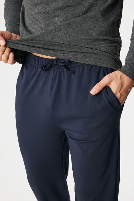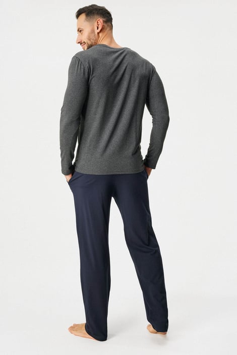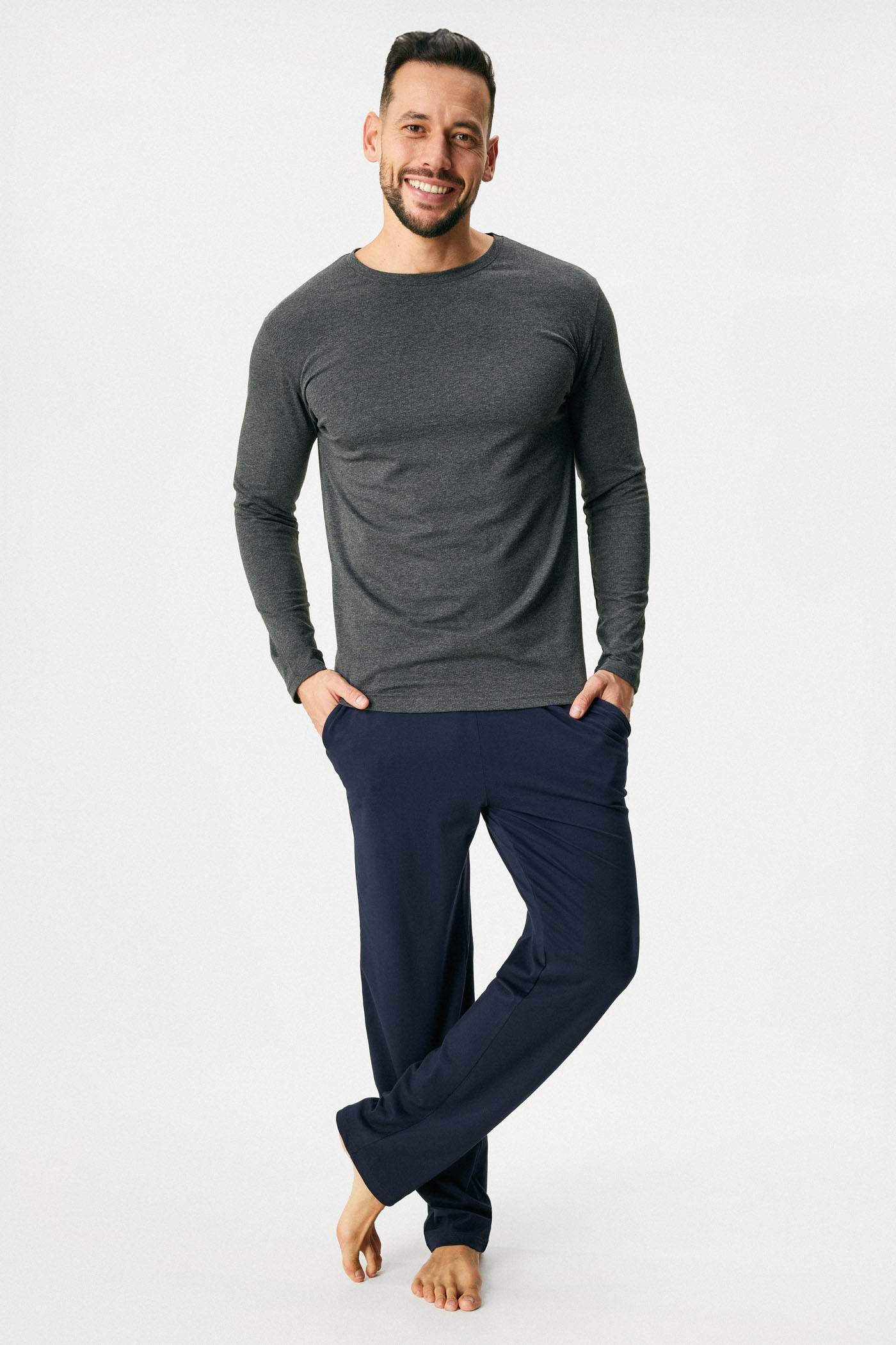 Bavlněné pyžamo MEN-A Jack z měkkého úpletu v jednoduchém provedení bez zbytečných příkras. Šedé triko s dlouhým rukávem doplňují tmavě modré kalhoty. V pase guma i zavazování, v bocích kapsy. Navrženo specialisty Astratexu.