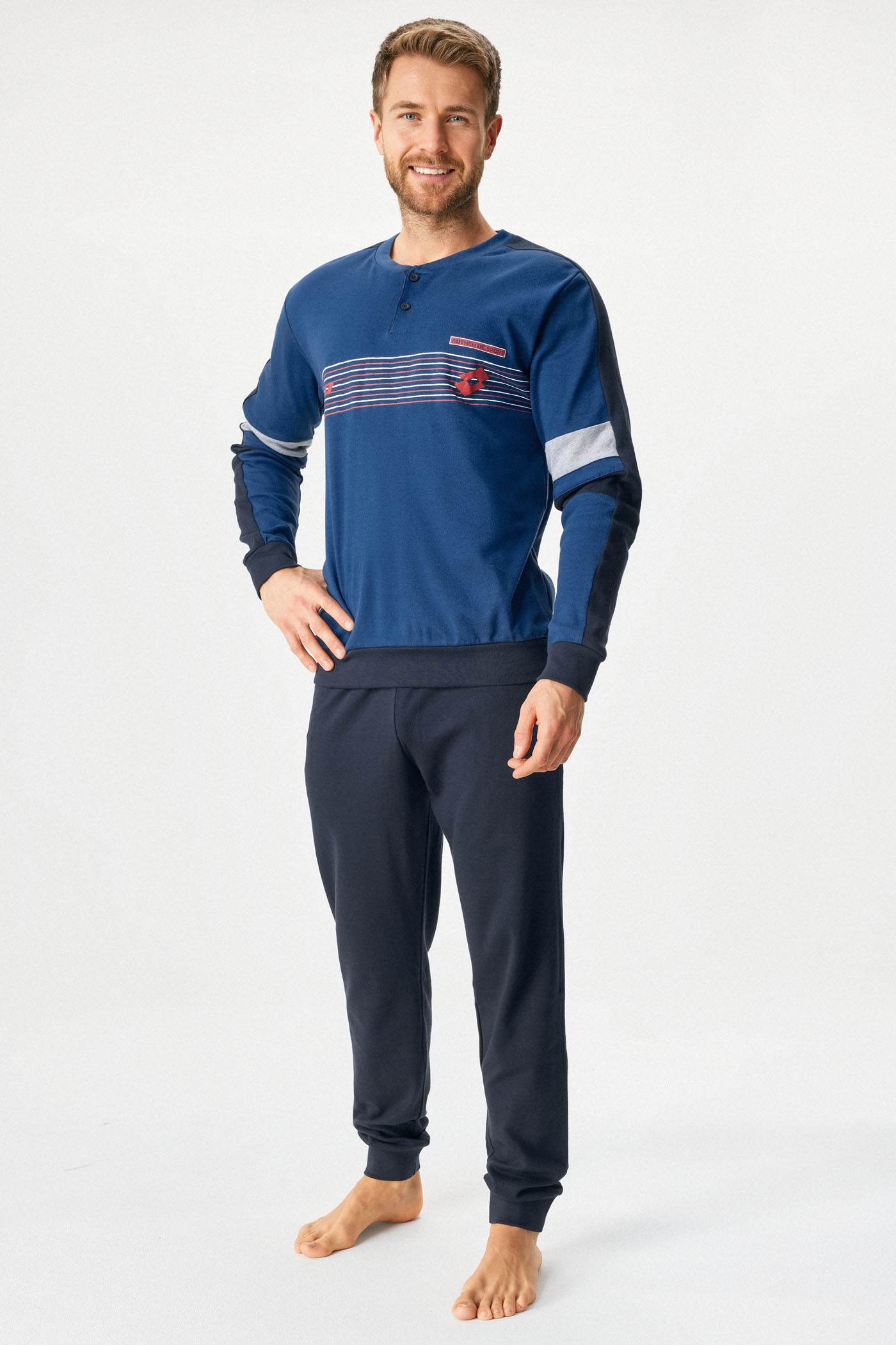 Bavlněné pyžamo Thiago z měkkého úpletu ve sportovním designu pro vaše noční pohodlí. Horní díl zdobí výstřih na knoflíčky. Dlouhé rukávy i kalhoty jsou zakončené manžetami.
