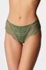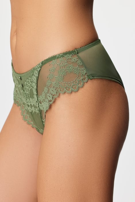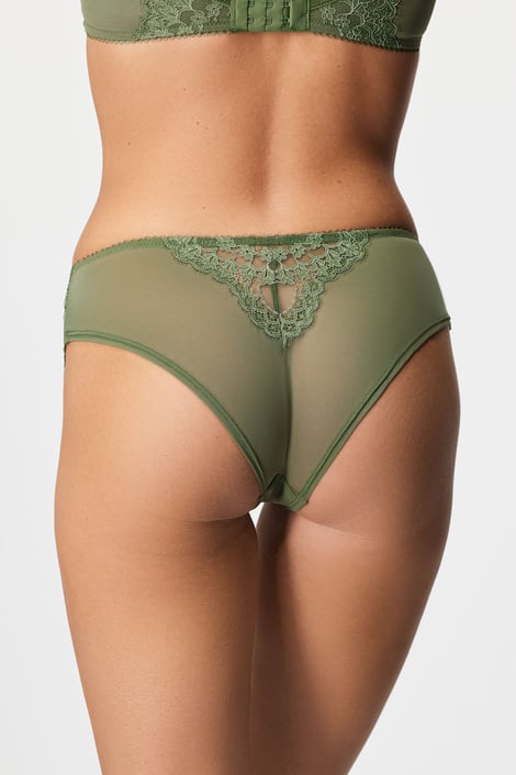 Brazilské kalhotky Hunkemöller Daisy Green v olivovém odstínu zelené. Z bohatě vyšívané krajky a decentně průsvitného tylu. Zdobeny drobnými knoflíčky.