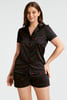 Dámské pyžamo Calina II si jednoduše zamilujete. Kabátek s krátkým rukávem i šortky jsou ušité z hebkého saténu, který ladně splývá po těle. V elegantním černém provedení s červenými pusinkami.