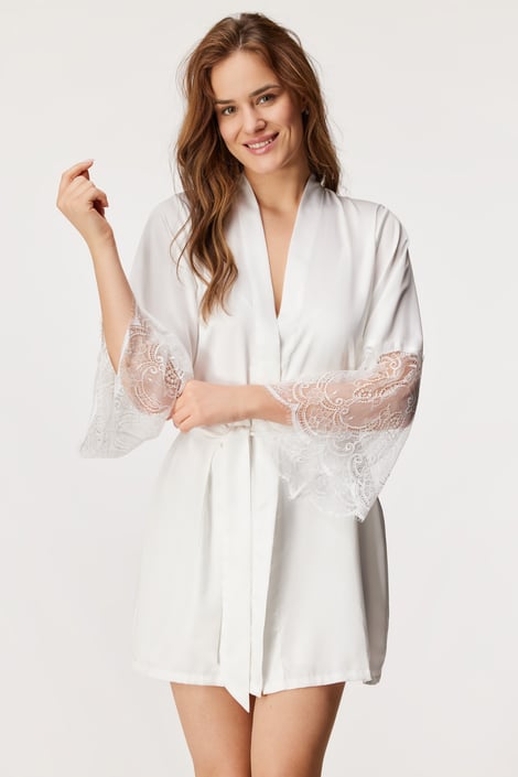 Dámský saténový župánek Bride pro váš výjimečný den.Na zadní straně kamínkový nápis, rukávy tvoří lehoučká krajka.