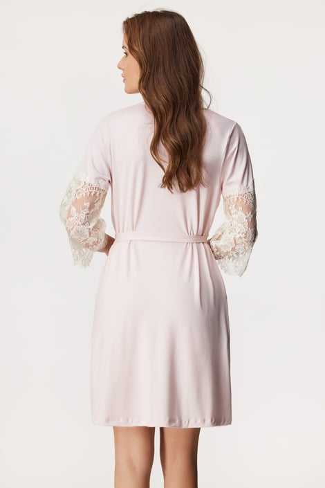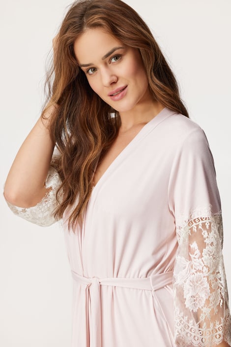Lehoučký župánek Adel z měkké viskózy, ve které se budete cítit opravdu pohodlně. Ladně splývá po těle a kopíruje jeho křivky. Romantické růžové provedení zdobí na koncích rukávů květinová krajka.