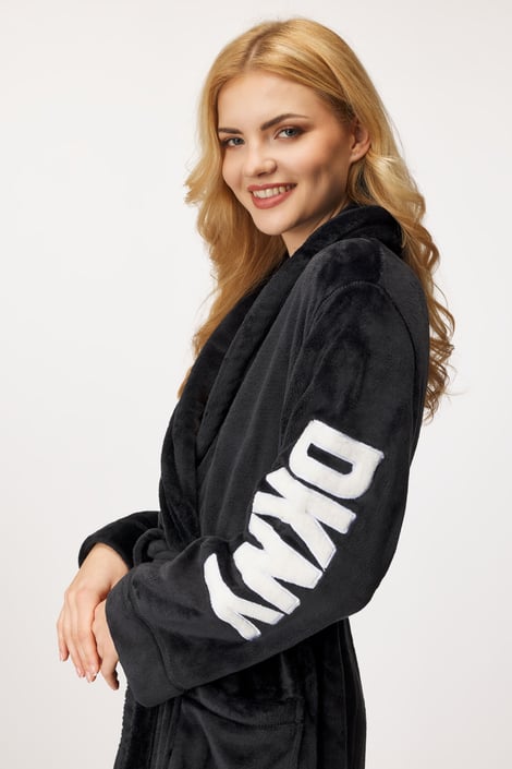 Hřejivý dámský župan DKNY Noir z měkounkého mikroplyše. Na rukávu logo značky.