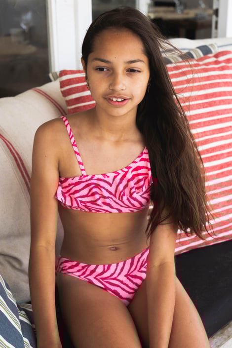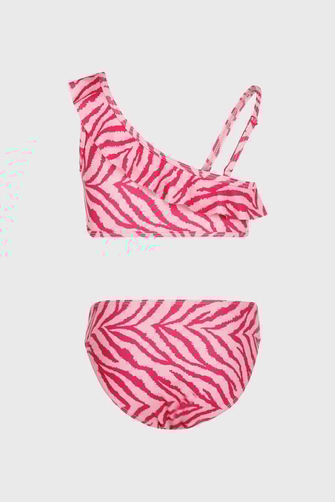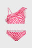 Dívčí dvoudílné plavky Pink zebra v barevném zvířecím vzoru. Horní díl v asymetrickém střihu na jedno rameno zdobí ozdobný kanýrek, spodní je v klasickém střihu.