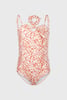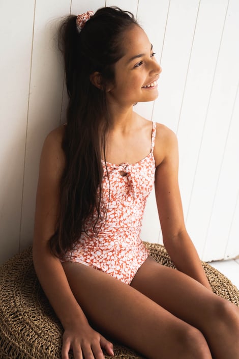 Dívčí jednodílné plavky Sunny s abstraktním vzorem. Na zádech vynikají překřížená ramínka.