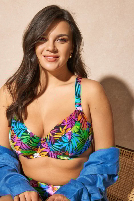 Dvoudílné plavky Muna si hravě poradí s bujnějšími křivkami. Nevyztužená podprsenka s kosticemi a košíčky v oblíbeném T střihu prsa přirozeně zaoblí. Ramínka si délkově přizpůsobíte. Doplněno klasickými kalhotkami. Ve výrazném tropickém designu.