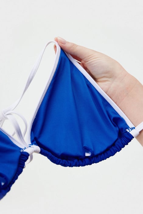 Dvoudílné plavky PINK STORM Color Pop Blue byly navrženy specialisty Astratexu v oblíbeném střihu. Trojúhelníkové košíčky jsou nevyztužené, ale opatřené vyjímatelnými vycpávkami pro tvarování poprsí. Po obvodové šňůrce je můžete libovolně posouvat. Zavážete dle potřeby na zádech i za krkem. Na míru vašim křivkám si zavážete i boky klasických bikini kalhotek. S kontrastním lemováním.