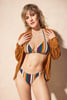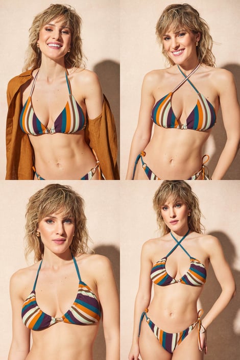 Dvoudílné plavky Stripelle Triangle v mladistvém designu z efektního pruhovaného piké. Podprsenka oblíbeného trojúhelníkového tvaru obsahuje vyjímatelné vycpávky pro dotvarování poprsí. Ramínka i obvod jsou na zavázání. Na míru si zavážete i boky klasických kalhotek. Zdobeno kovovými kroužky zlaté barvy. Navrženo specialisty Astratexu.