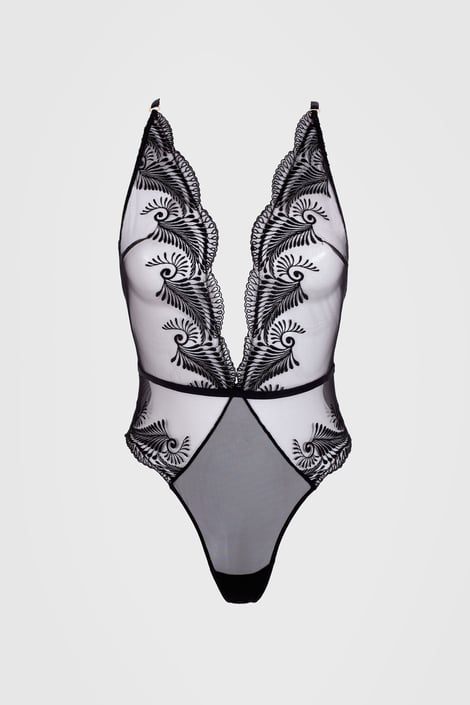 Elegantní body Bluebella Rafaela z průhledného vyšívaného tylu, doplněného o strappy pásky. Rafinovaný kousek s překříženými ramínky a zlatými kovovými detaily.