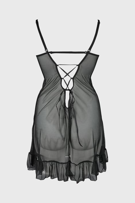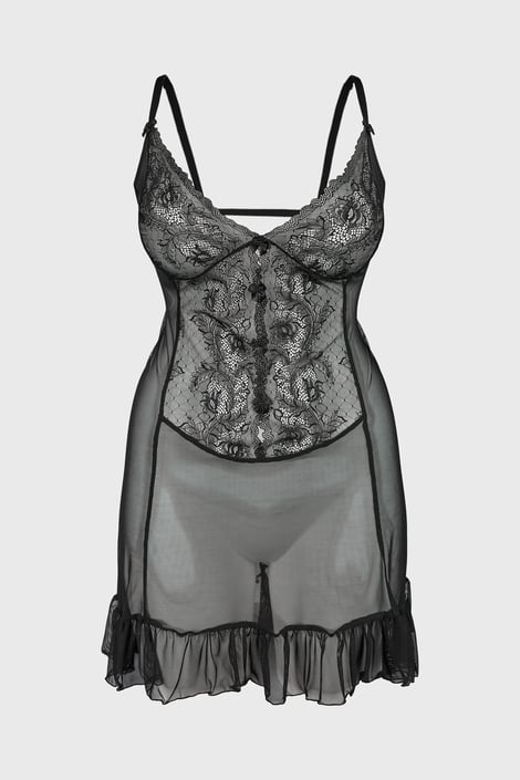Erotická noční košilka Vela v elegantní černé barvě – s decentně průsvitnými košíčky a nápaditou květinovou krajkou.