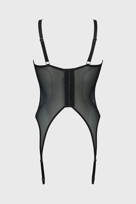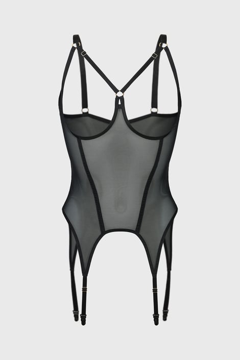 Erotický korzet Black Shadow pro chvilky svádění. Jemňoučká síťovina je smyslně průsvitná a rafinovaně poodhaluje ženské křivky. Otevřené košíčky nechají vyniknout prsům.