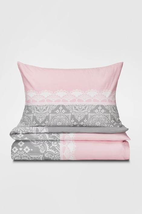 Povlečení Remar dodá vaší ložnici elegantní vzhled. Zdobí ho bílý ornamentální motiv, který na šedém a růžovém podkladu nádherně vynikne. Díky praktickému zapínání na zip půjde povlékání samo.