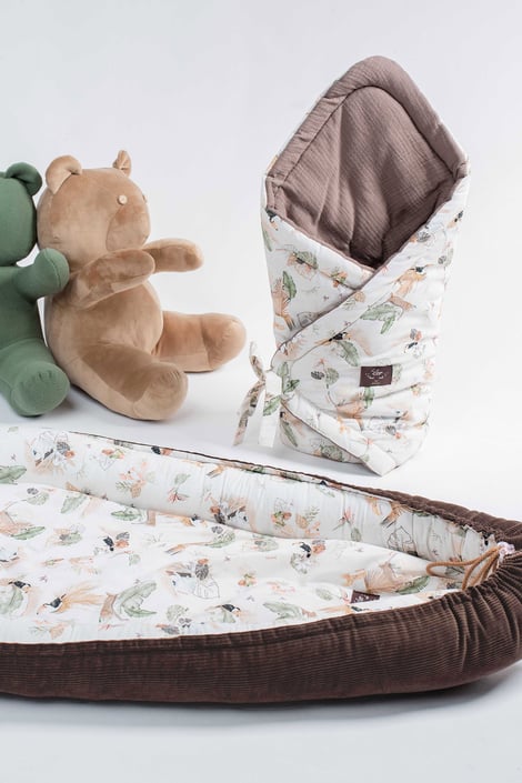 Útulné hnízdečko pro miminko Roberto Safari využijete v postýlce, na gauči, na zemi, v prvních týdnech může nahradit i dětskou postýlku. Děťátko se v něm bude cítit pohodlně a bezpečně. Hnízdečko je vyrobené ze 100% bavlny. Vnitřní stranu zdobí exotická zvířata a rostliny, vnější strana je z hnědého manšestru.