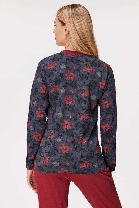 Horní díl dámského pyžama Flower je ušitý z čisté bavlny. Tričko s dlouhým rukávem je zdobené květinovým vzorem. Zapínání na knoflíky po celé délce.