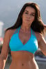 Horní díl dámských plavek Azara ve výrazném odstínu modré. Nevyztužené košíčky jsou podšité jemnou druhou vrstvou a přecházejí v zavazovací ramínka. Nižší střed krásně formuje dekolt.