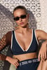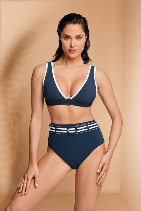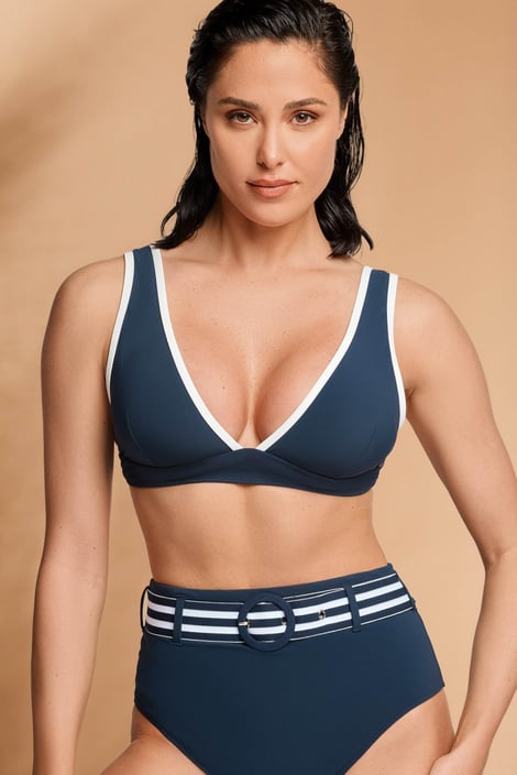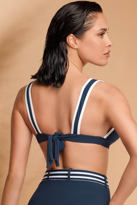 Horní díl plavek David Bridget v námořnickém designu zvýrazní vaše poprsí. Trojúhelníkové košíčky mají vyjímatelné vycpávky pro dokonalé dotvarování, nízký střed nechá prsa hezky vyniknout. Ramínka jsou pevná, obvod si v zadní části zavážete dle potřeby.