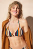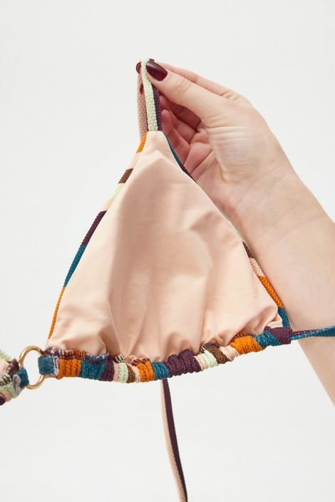 Horní díl plavek Stripelle Triangle byl navržen specialisty Astratexu z efektního pruhovaného piké v oblíbeném trojúhelníkovém střihu. Košíčky obsahují vyjímatelné vycpávky pro dotvarování poprsí. Střed zdobí kovový kroužek zlaté barvy. Ramínka i obvod jsou na zavázání.