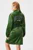 Krátký župan Elm Green prémiové značky DKNY z hřejivého mikroplyše v elegantní zelené barvě. Jednoduchý design se šálovým límcem, s kapsami a zavazováním v pase.