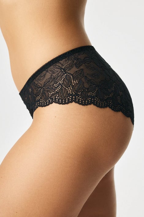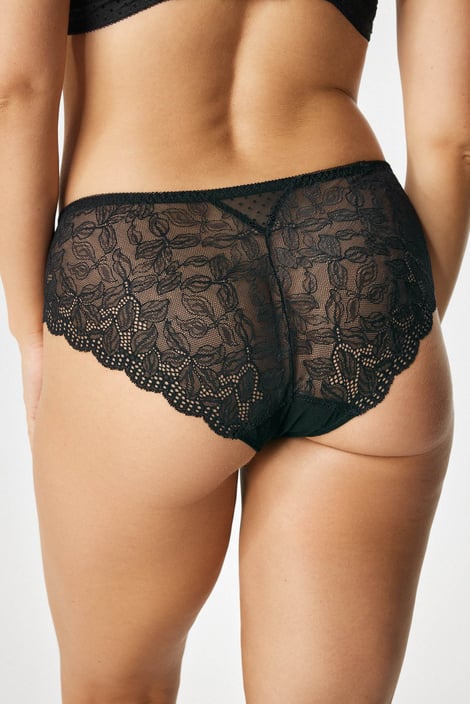 Klasické kalhotky Melody zahalí zadeček a boky do bohaté krajky. Přední část tvoří jemný tyl s drobnými puntíky.
