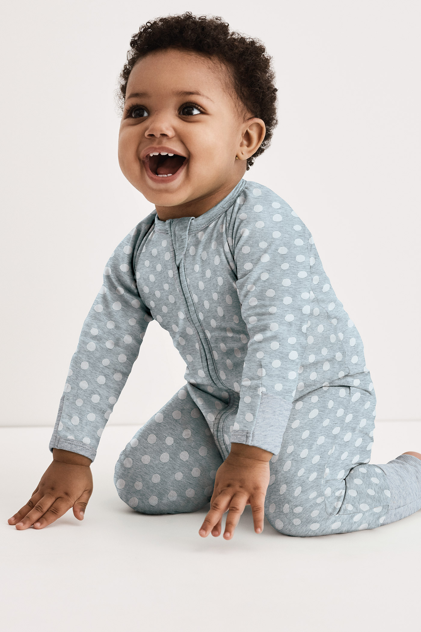 Kojenecký overal Pois z měkkého úpletu zdobí malé puntíky. Dlouhé rukávy i nohavice mají na manžetách dvojitou látku, díky které je možné schovat ručičky i nožičky. Po celé délce praktické zapínání na zip, který lze rozepnou z obou stran.