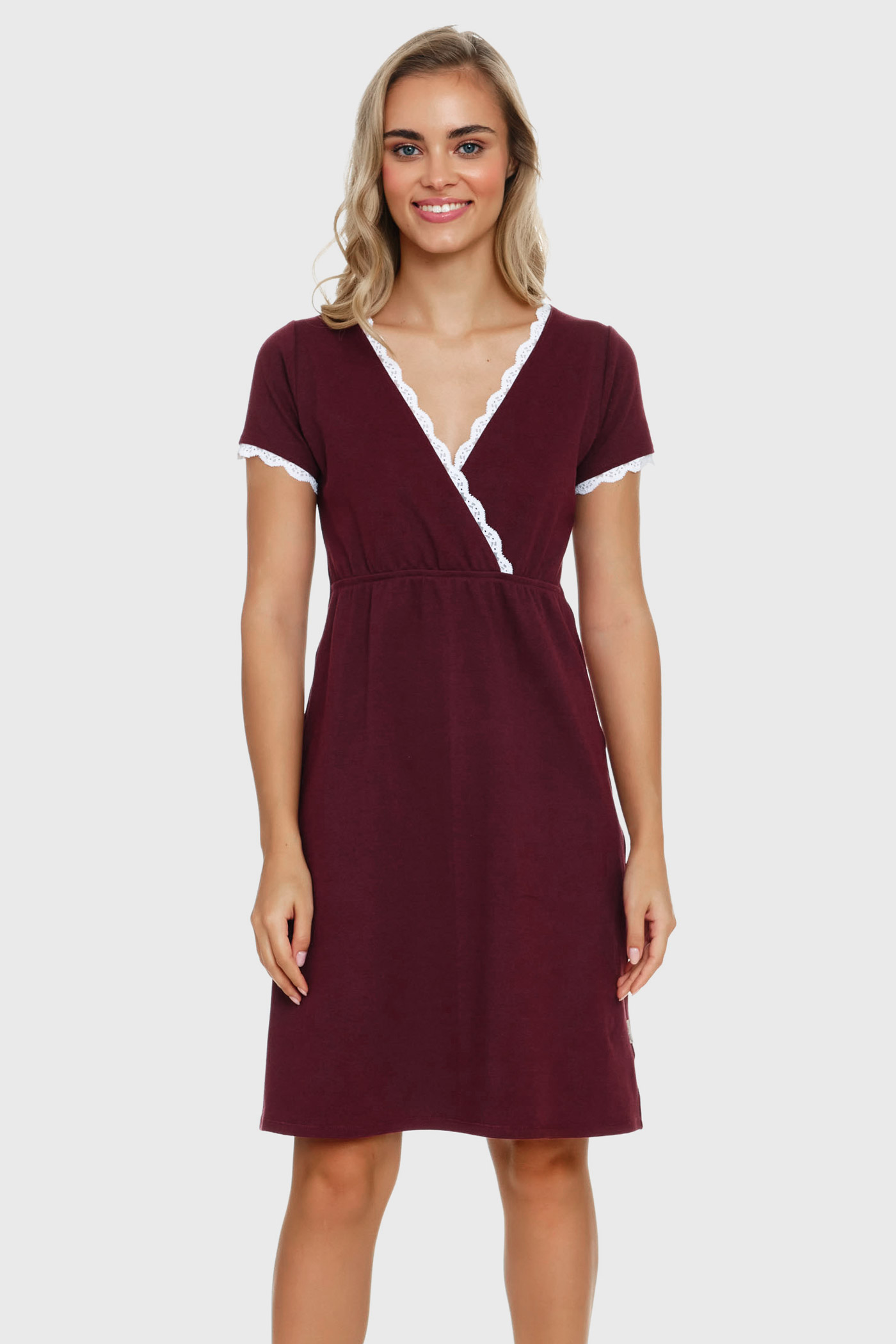 Kojicí bavlněná košilka Sangria pro komfort všech maminek. Oblast košíčků stačí pro nakrmení miminka jednoduše odhrnout.