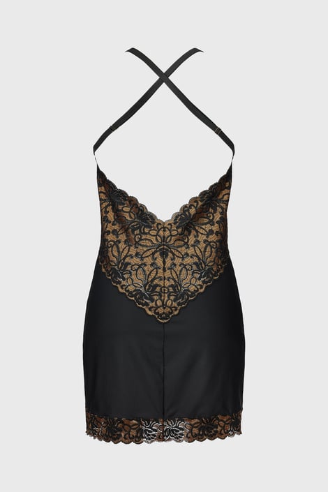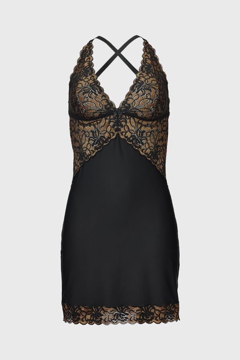 Dámská noční košilka s puncem luxusu. V hlavní roli bohatá zlatočerná krajka, která působí sexy i elegantně. Střih jemně kopíruje ženské křivky.