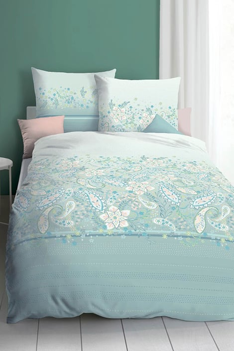 Povlečení Marina z hebkého bavlněného makko saténu je jasnou volbou pro ty, kteří mají rádi pastelové barvy. Jemný mátový podklad zdobí květiny a kašmírový vzor. Povlak na polštář má navíc na druhé straně pruhy.