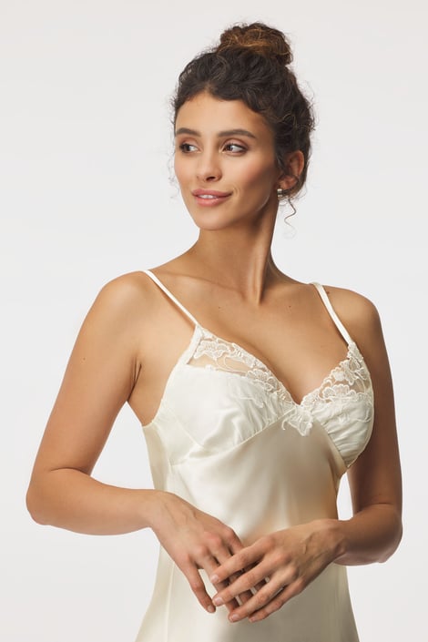 Elegantní noční košilka Daphne z decentně lesklého saténu. Košíčky z jemňoučké síťoviny zdobí něžná květinová výšivka.