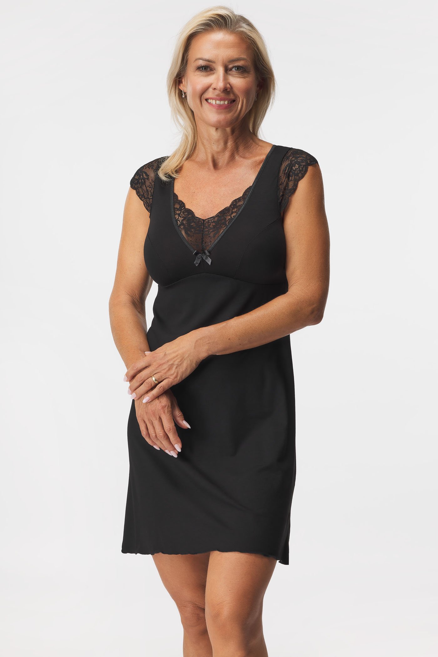Luxusní noční košilka Nancy z příjemné viskózy zaujme průhlednými zády z elastického tylu i krajkovými detaily v dekoltu a na rukávech.