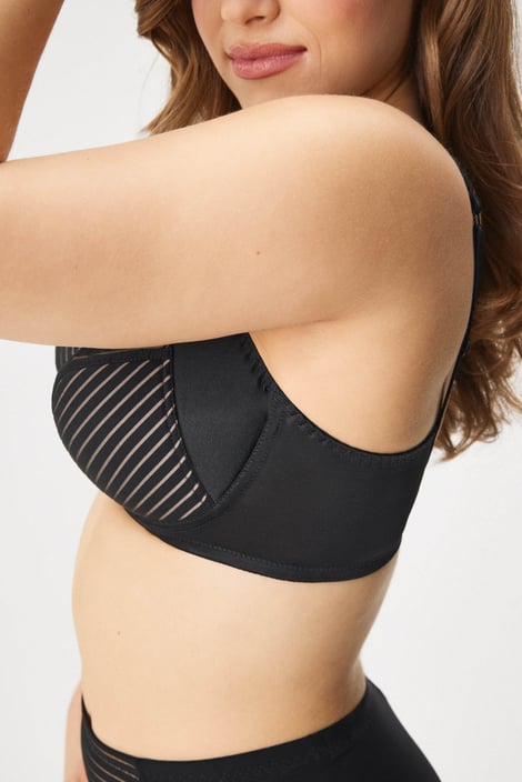 Dokonale zpracovanou podprsenku Caressence ocení majitelky velkého poprsí. Polovyztužené košíčky mají podšívku z měkkého úpletu, linii dekoltu tvoří průhledná síťovina s efektními proužky. Boční díly ňadra pomohou nasměrovat do výstřihu, kde je spolehlivě podrží vyšší střed i pružný lem. Širší vypodložená ramínka si hravě poradí s větší váhou a nikde se nezařezávají. Navrženo specialisty Astratexu.