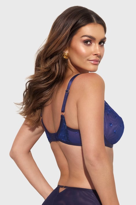 Smyslná podprsenka Foxy z jemného tylu v temné modročerné variaci. Nevyztužené košíčky v lichotivém T střihu ňadra přirozeně zaoblí. Výstřih s pružným lemem hezky přilne k tělu. Ramínka jsou délkově nastavitelná.