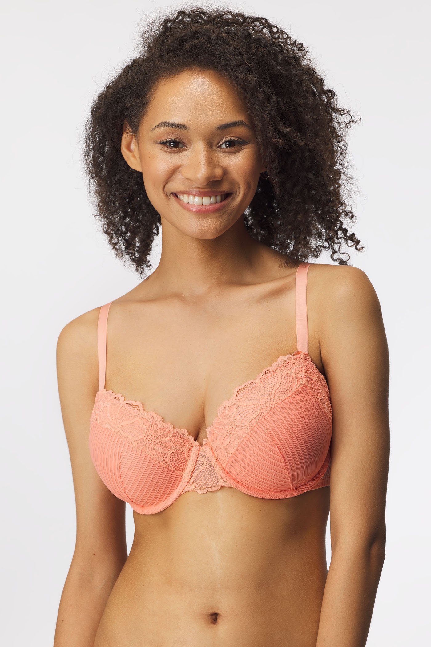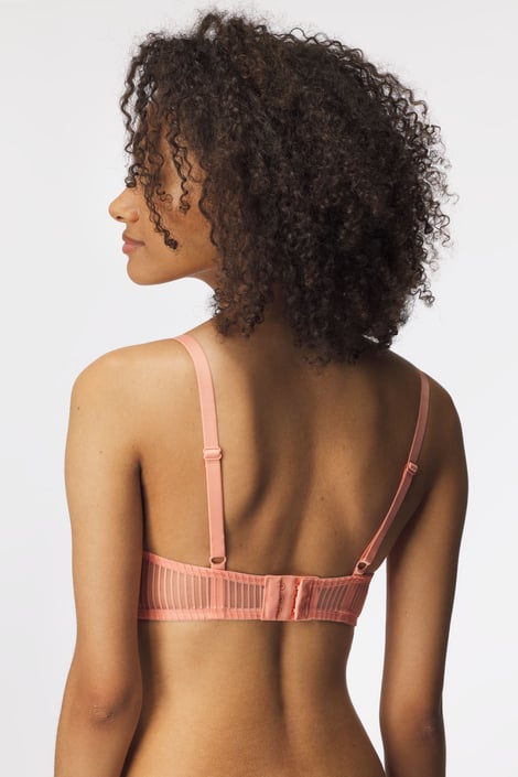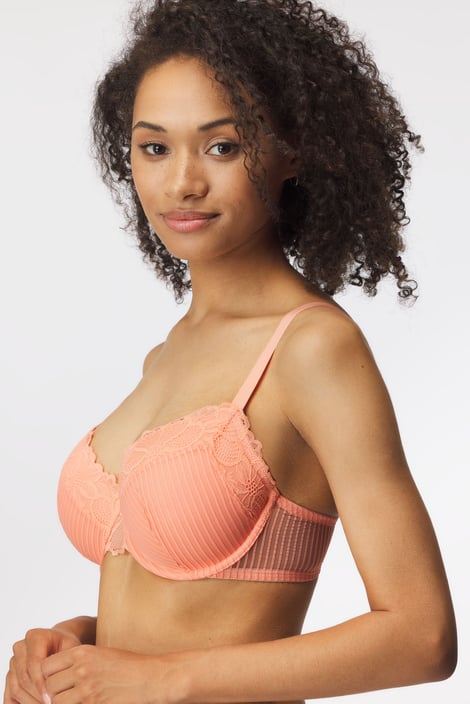 Podprsenka Karly Coral v jemném korálovém odstínu. Košíčky vás překvapí svou měkkostí i komfortním střihem, který lichotivě tvaruje menší i větší ňadra. Decentní proužky doplňuje něžná květinová krajka.