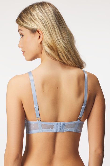 Podprsenka Recent Viewpoint vnese do vašeho prádelníku jemné pastelové tóny. Vyztužené košíčky jsou potažené vyšívanou krajkou, kterou v horní části střídá průsvitný tyl s puntíky.