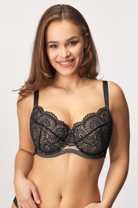 Krajková podprsenka Toffee je oslnivým kouskem pro ženy s většími ňadry. Nevyztužené košíčky mají na boku podpůrný boční díl z jemného tylu, který lehce přiblíží prsa více k sobě.
