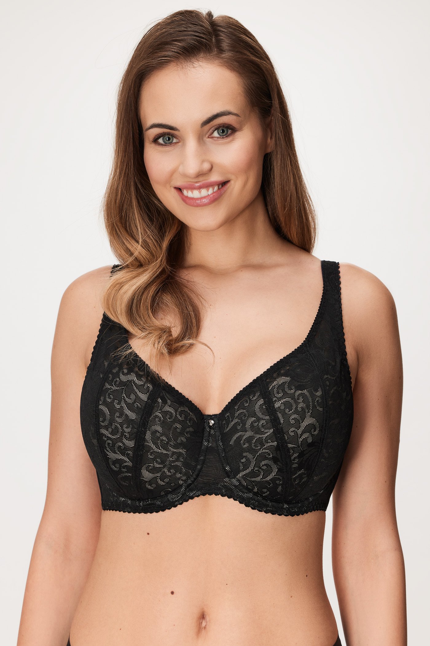 Vyztužená podprsenka Triangle bra Fern efektně kombinuje béžový podklad a černou krajku. Košíčky mají dva svislé švy, které prsa krásně zakulatí. Vnitřní část košíčků je pro větší komfort bavlněná.