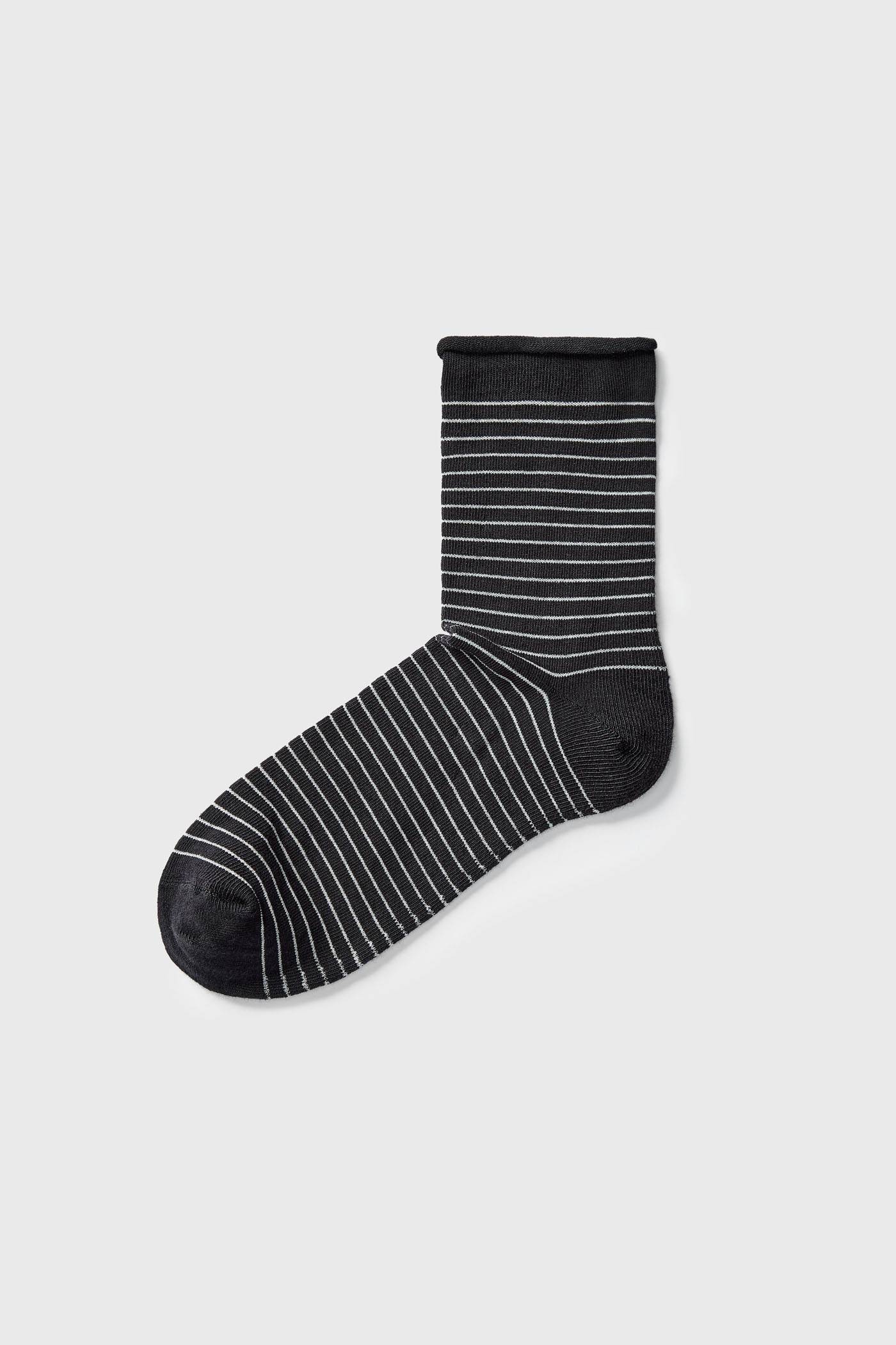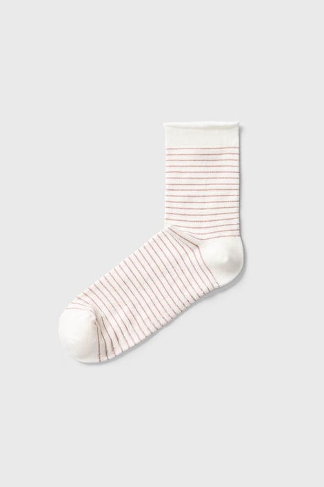 Na obrázku není vidět, že proužky jsou s lurexem, tzn stříbrné třpytivé. Takže ponožky jsou nejen velice příjemné, lem je široký, neškrtí, ale mají i elegantní šmrc. Jsem velice spokojená.