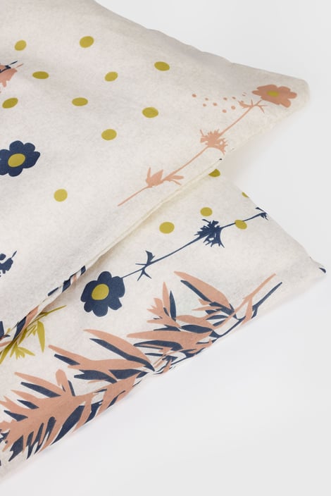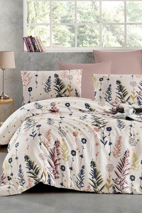 Pokud dáváte přednosti přírodním motivům, vyberte do své ložnice povlečení Mina z hladké bavlny. Na světlém podkladu jsou květiny a listy v lososové, zelené a modré barvě.