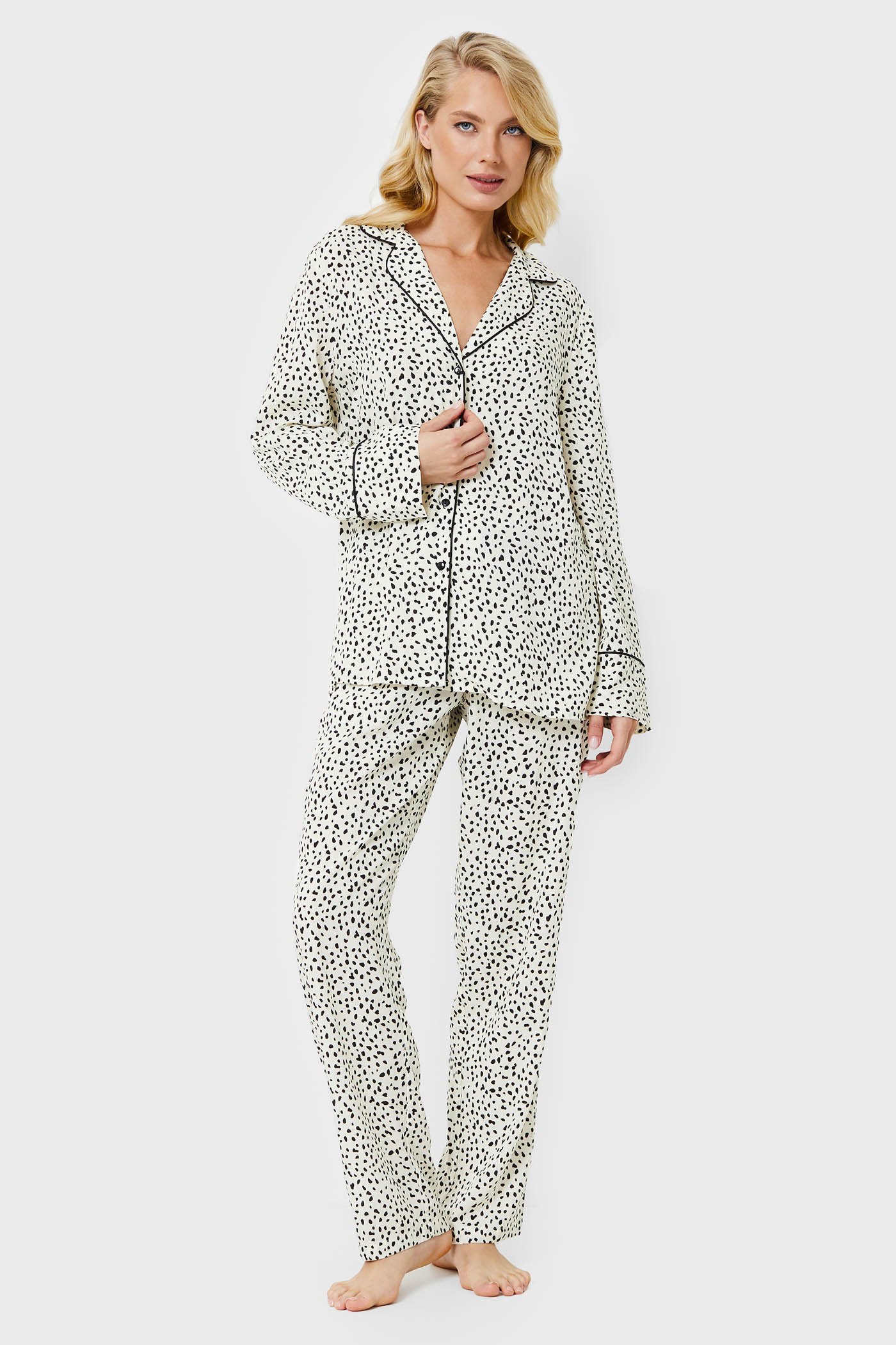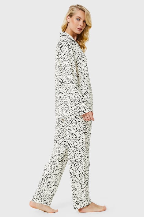 Dámské pyžamo Bethany si zamilujete na první obléknutí. Je ze 100% viskózové tkaniny, která je jemná a měkká na dotek, na těle je lehká jako pavučinka a ladně splývá po těle. Pyžamový kabátek i dlouhé kalhoty zdobí decentní puntíky.