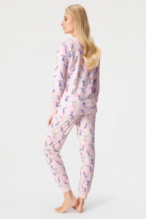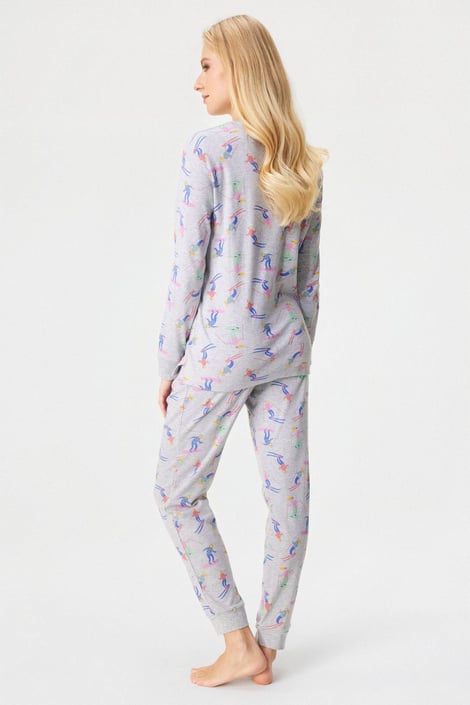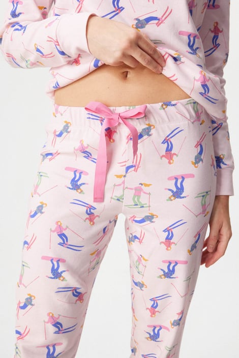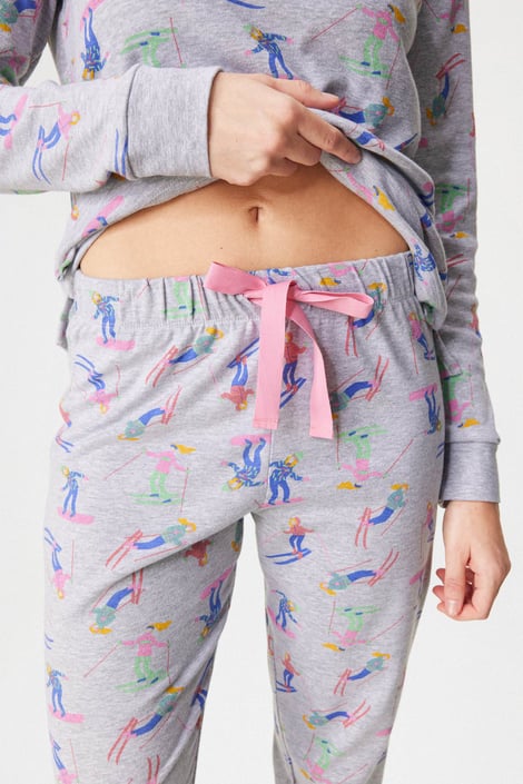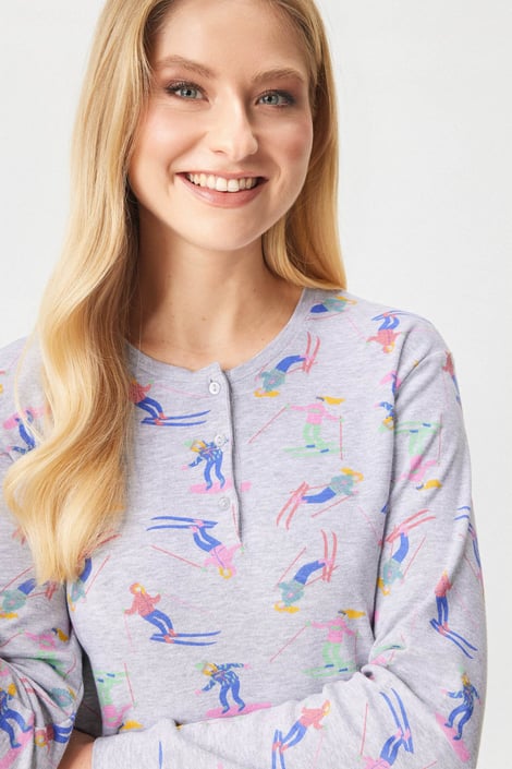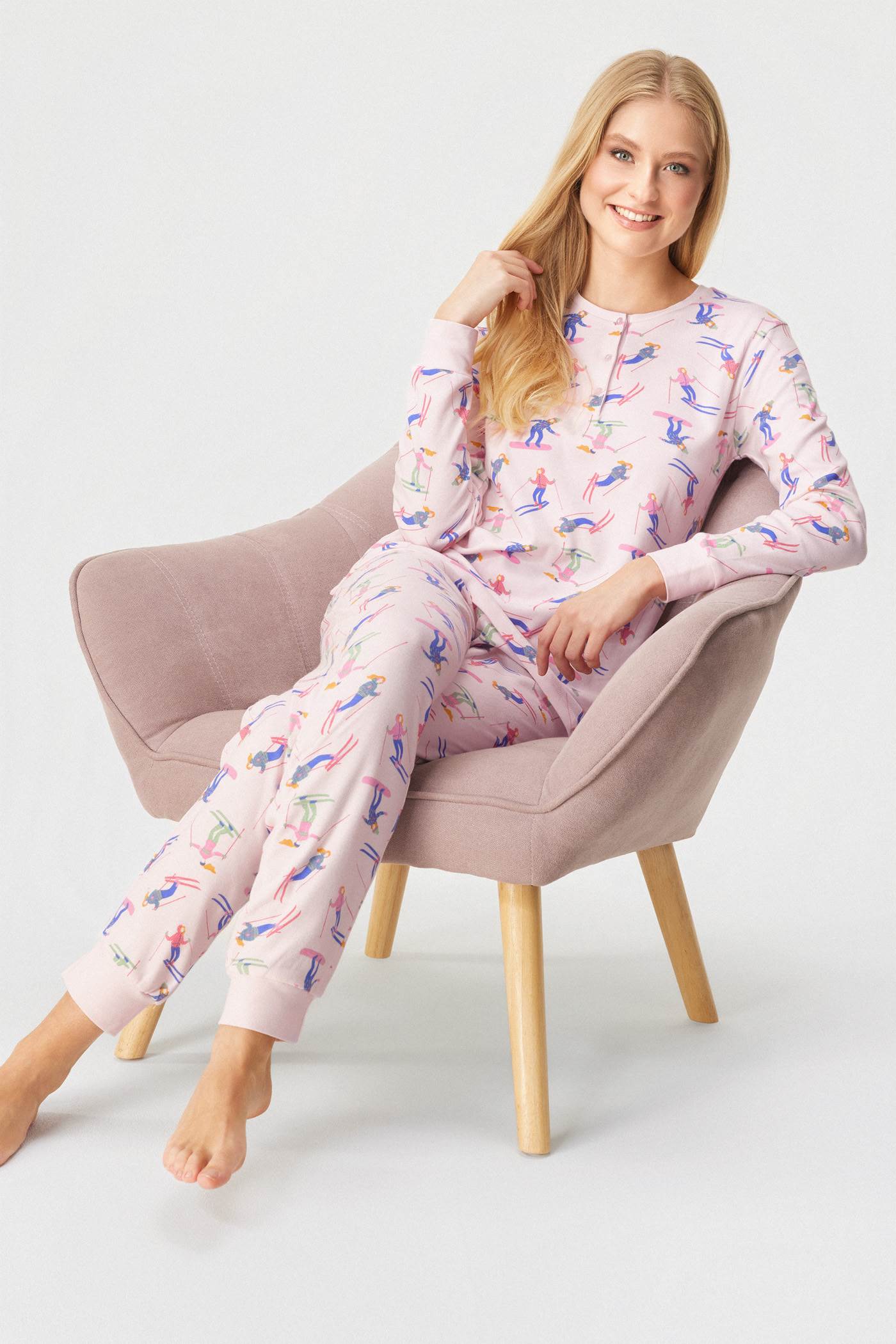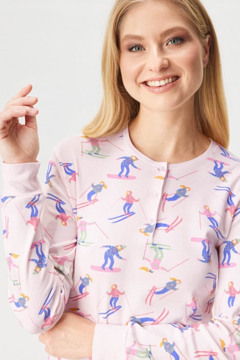 Bavlněné pyžamo Winter Mood z měkkého úpletu se zimním potiskem lyžařů vám zajistí noční pohodlí. Jednoduchý horní díl zdobí výstřih na knoflíčky. Kalhoty jsou v pase do gumy i na zavazování. Dlouhé rukávy i nohavice zakončují manžety.