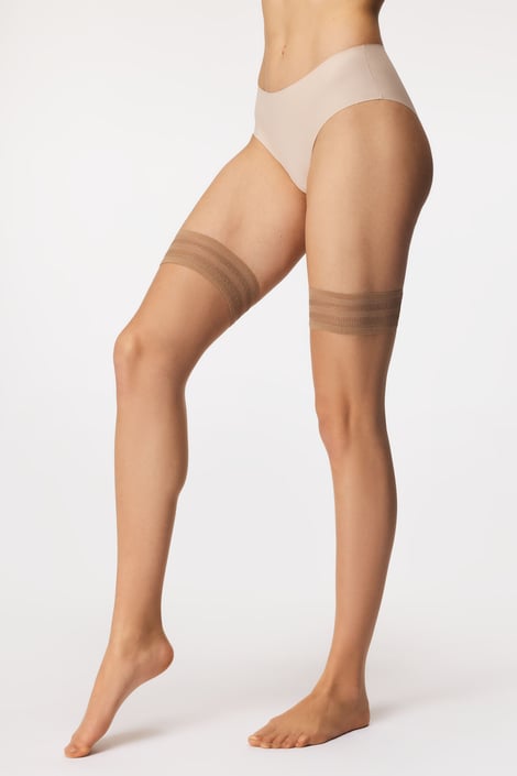 Hladké samodržící punčochy OMSA Sunlight pro dokonalý vzhled vašich nohou. Díky silikonovému pásku na vnitřní straně drží perfektně na místě a nikam se neposouvají.