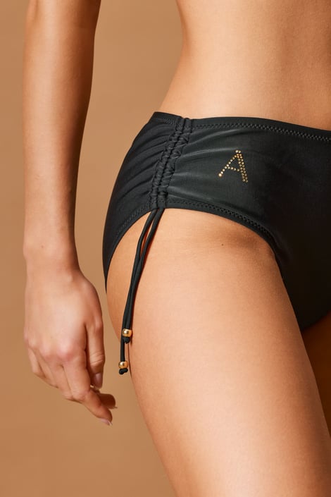 Spodní díl plavek Gold Flower Plus v jednoduchém střihu i designu. Elegantní černé provedení zdobí kamínková aplikace na pravém boku. Na bocích zdrhovací šňůrky. Z dílny Astratexu.