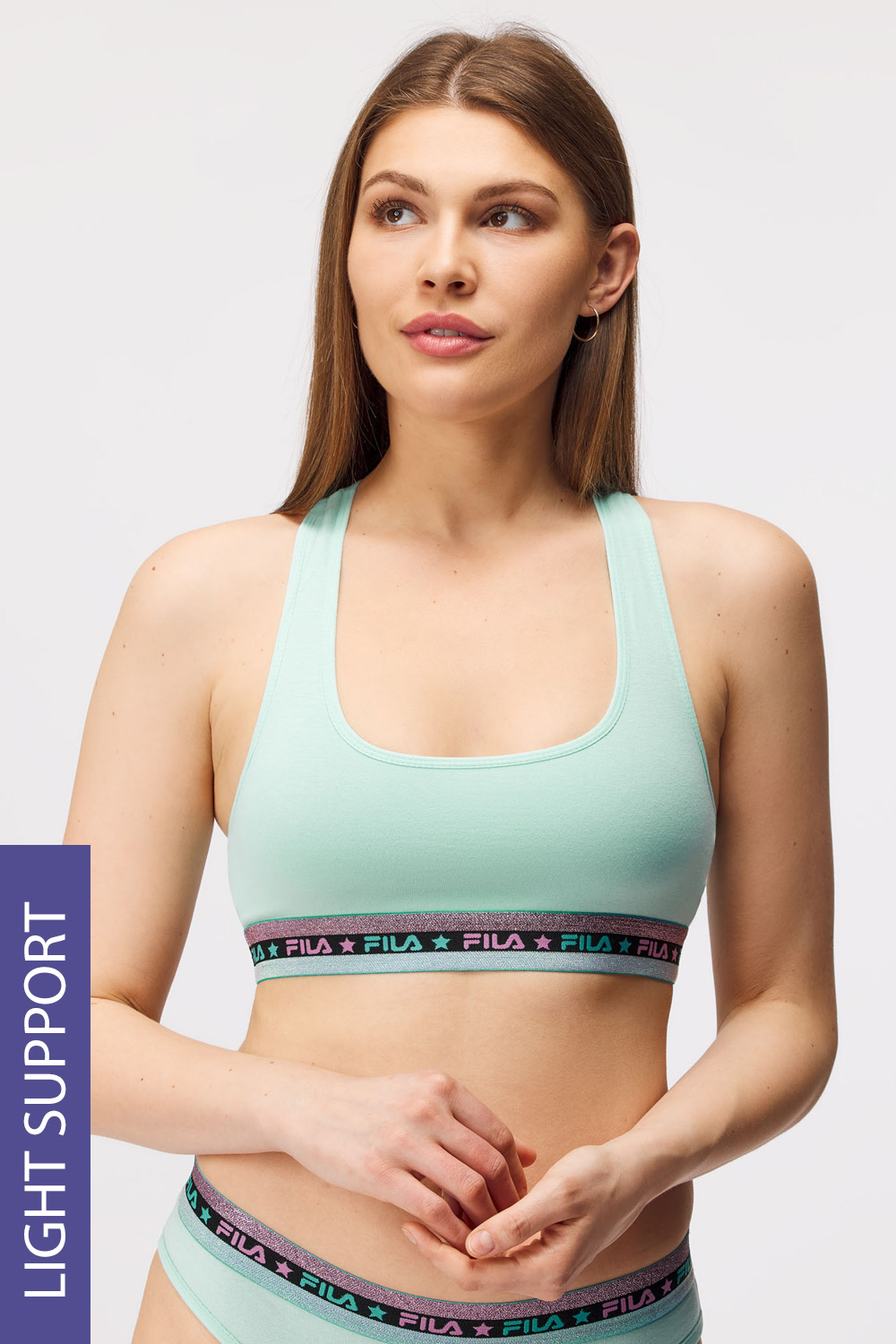 Sportovní bavlněná podprsenka FILA Underwear Aqua Green s lehkým stupněm opory. Pod prsy ozdobná guma se třpytivou lurexovou nitkou.