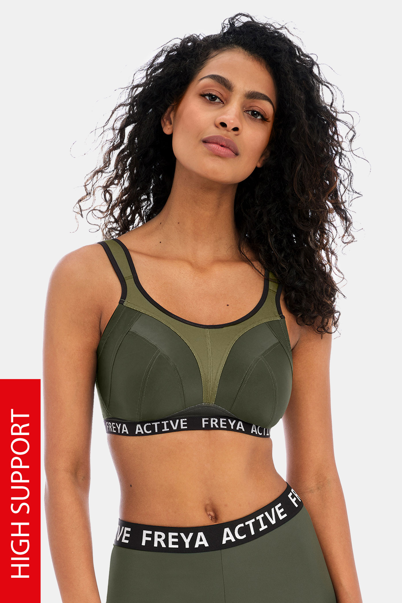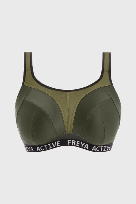 Sportovní podprsenka Freya Dynamic Khaki pro ženy s plnějším dekoltem. Nevyztužené košíčky tvoří pevný materiál, který jemně prsa obepne a nedovolí jim žádný pohyb navíc. Vysoký střed ňadra pěkně podrží, měkce podložená ramínka uleví zádům a šíji.