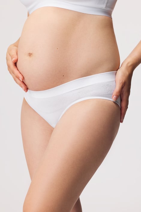Těhotenské kalhotky Hanna v pohodlném bezešvém provedení. S antibakteriální úpravou a výtažkem z Aloe Vera a jojoby pro maximální pohodlí i citlivé pokožky.