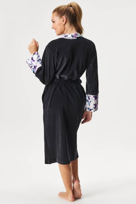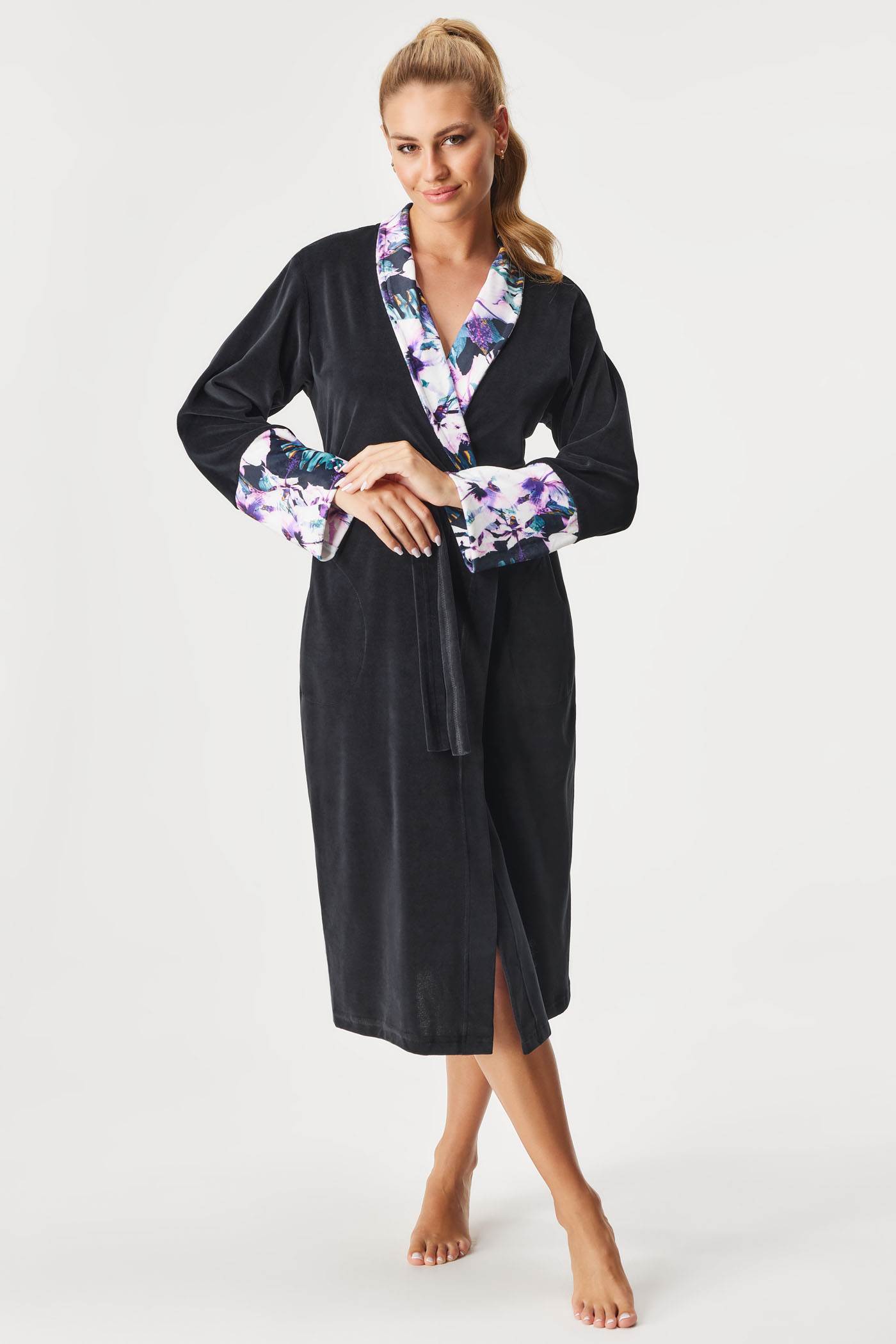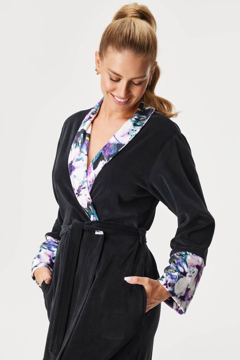Dámský župan Laura vás bude hýčkat hebkým sametem. S kontrastním květinovým motivem.